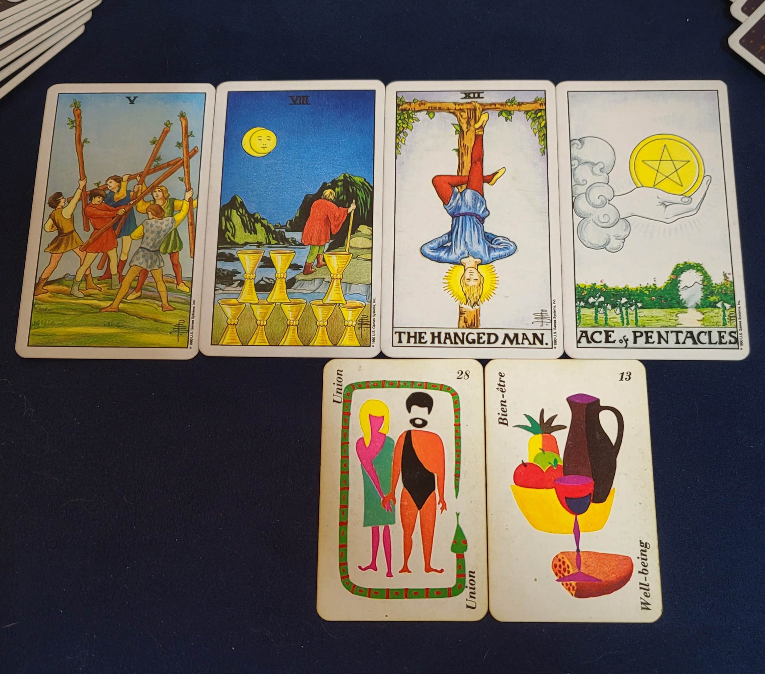 우선 첫카드가 사람들이 각기 다른 옷을 입고 나무를 들고 서로가 자기주장을 하고 있는 완드5번 카드인데 이 카드는 여러가지로 일이 엮어 있거나 꼬여 있을때 나오는 카드인데 그 다음 카드를 보면 컵8번 카드가 나와 있어서 이렇게 카드를 유추를 해볼수가 있겠는데. 지금 여러가지로 하는 일에서 잠시 접어두고 어디가로 떠나는 모습인데 일적으로 어딘가에 꼭 묶여있는 나무에 매달린 카드 행그맨 카드가 나와 있거든요.